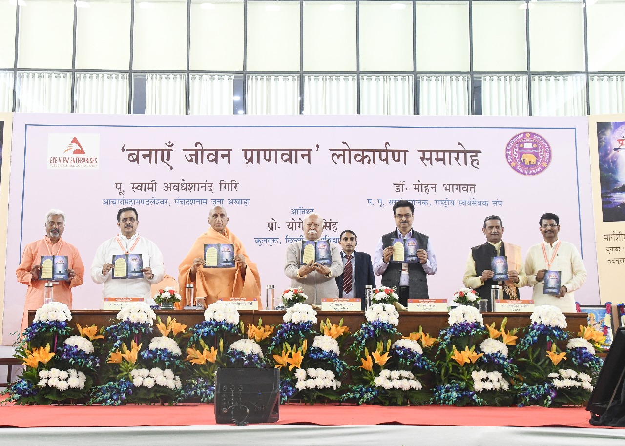 सरसंघचालक डॉ. मोहन भागवत जी मंगलवार को नई दिल्ली में मुकुल कानिटकर द्वारा लिखित जीवन मूल्यों पर आधारित पुस्तक ‘बनाएं जीवन प्राणवान’ के विमोचन के अवसर पर संबोधित कर रहे थे. दिल्ली विश्वविद्यालय के उत्तरी परिसर में आयोजित पुस्तक विमोचन कार्यक्रम में पंचदशनाम जूना अखाड़ा के आचार्य महामंडलेश्वर पूज्य स्वामी अवधेशानंद गिरि जी महाराज तथा दिल्ली विश्वविद्यालय के कुलपति प्रो. योगेश सिंह विशिष्ट अतिथि के रूप में उपस्थित थे.
