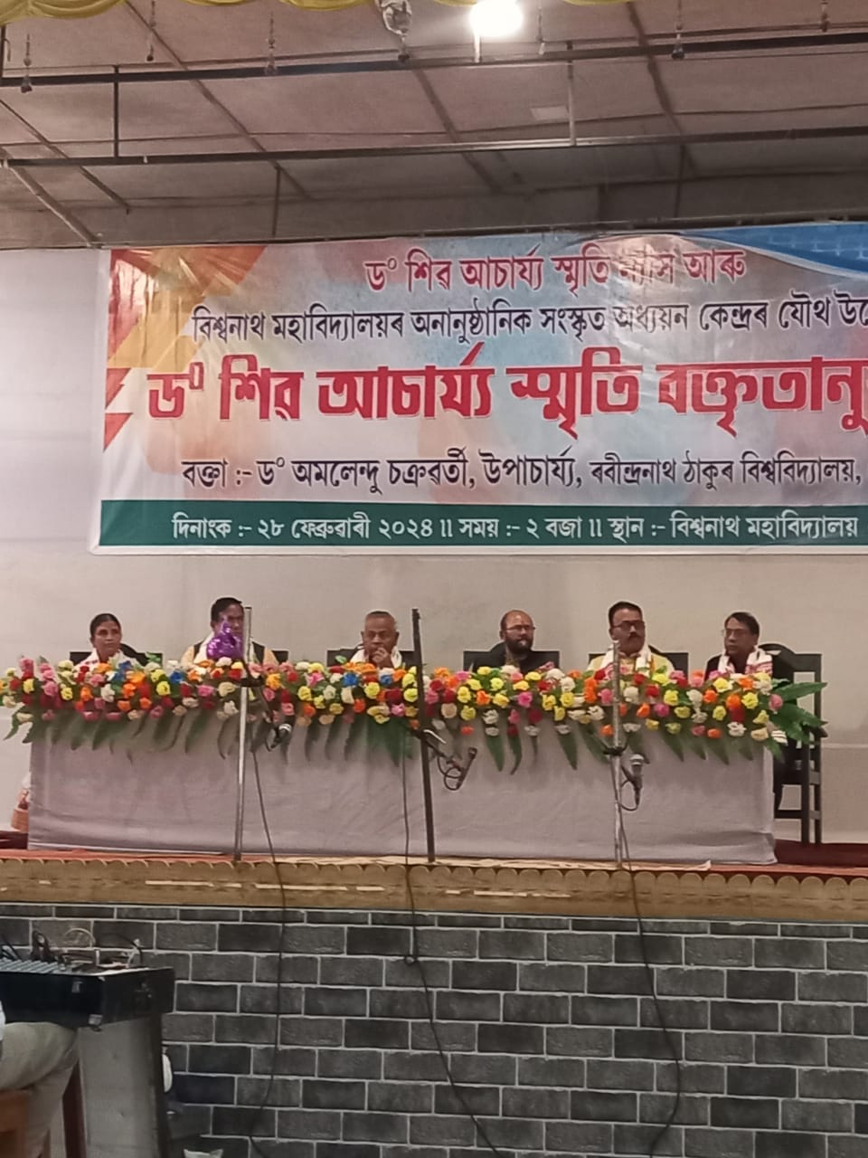 যোৱা ২৮ ফেব্ৰুৱাৰী তাৰিখে বিশ্বনাথ চাৰিআলি মহাবিদ্যালয়ৰ প্ৰেক্ষাগৃহত অনুষ্ঠিত হৈ যায় ৭ম সংখ্যক ড৹ শিৱ আচাৰ্য্য স্মৃতি বক্তৃতানুষ্ঠান। এই বক্তৃতানুষ্ঠান আয়োজন কৰে ড৹ শিৱ আচাৰ্য্য স্মৃতি ন্যাস আৰু বিশ্বনাথ মহাবিদ্যালয়ৰ অনানুষ্ঠানিক সংস্কৃত অধ্যয়ন কেন্দ্ৰই যৌথ ভাবে। বক্তৃতানুষ্ঠানত মুখ্যবক্তাৰূপে ভাষণ প্ৰদান কৰে হোজাইস্থিত ৰবীন্দ্ৰনাথ ঠাকুৰ বিশ্ববিদ্যালয়ৰ উপাচাৰ্য্য ড৹ অমলেন্দু চক্ৰৱৰ্তীয়ে। “বেদত ৰাষ্ট্ৰৰ অৱধাৰণা আৰু ভাৰতৰ একাত্মতা” শীৰ্ষক ভাষণত ড৹ চক্ৰৱৰ্তীয়ে কয় যে অতি প্ৰাচীন কালতেই আমাৰ বেদত ৰাষ্ট্ৰৰ কল্পনা কৰা হৈছিল। আৰু সেই ৰাষ্ট্ৰৰ কোনো ভৌগোলিক সীমা নাছিল। আমাৰ ৰাষ্ট্ৰৰ মূল ভেটি আছিল সংস্কৃতি। যি সংস্কৃতিয়ে সমগ্ৰ মানব জাতিৰ লগতে জীৱজগতৰ লগতে জড়কো সাঙুৰি লৈছিল। ৰাষ্ট্ৰ শব্দৰ উৎস সম্পৰ্কে তেখেতে কয় যে “ৰাজ” শব্দৰ সৈতে ট্ৰন প্ৰত্যয় যোগ হৈ ৰাষ্ট্ৰ শব্দৰ উৎপত্তি হৈছে। ৰাজ শব্দৰ অৰ্থ হৈছে জিলিকি থকা বা উজ্বলি উঠা।