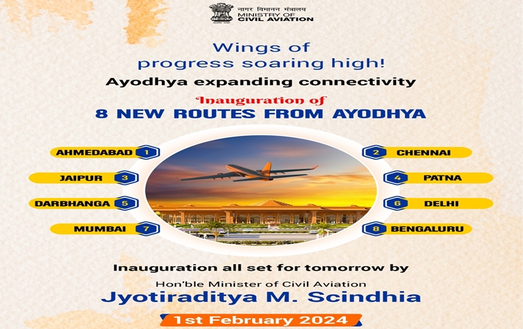 Eight new flight routes to be launched for Ayodhya 1 min read English News Eight new flight routes to be launched for Ayodhya ADMIN February 1, 2024 New Delhi. Ministry of Civil Aviation is set to launch eight new flight routes...Read More