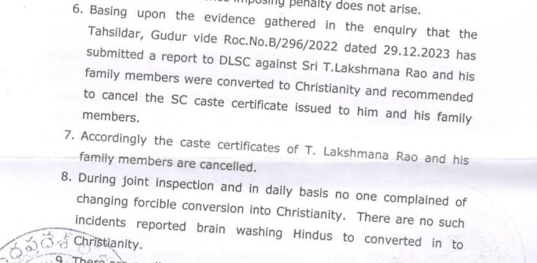 Victory of Villagers’ protest; government cancels SC certificates of Christian family in Vemulapalem 3 min read English News Victory of Villagers’ protest; government cancels SC certificates of Christian family in Vemulapalem ADMIN October 3, 2024 An enquiry conducted by the Tahsildar of Gudur confirmed the villagers’ claims, resulting in...Read More
