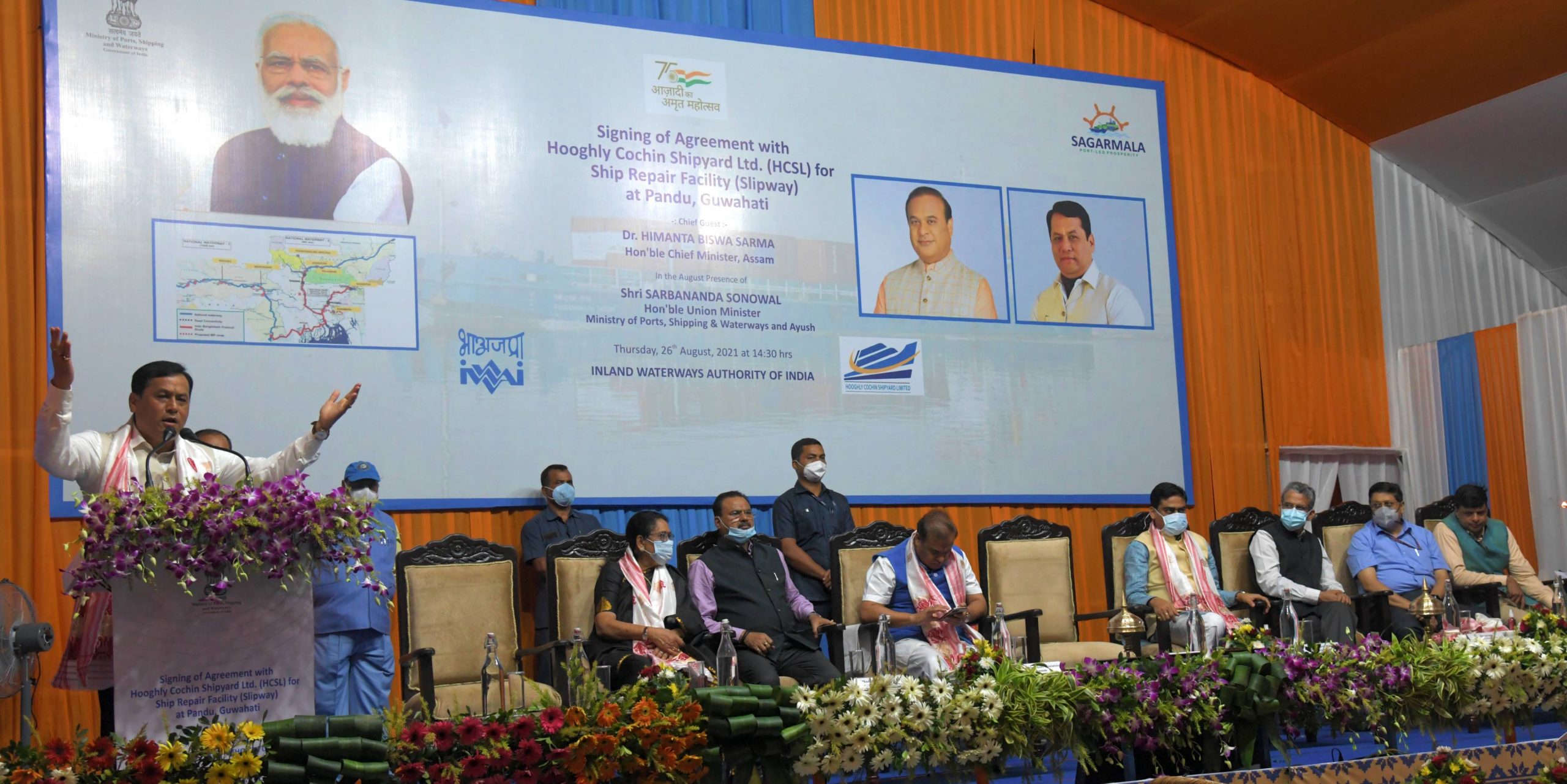 southern bank of mighty Brahmaputra. The design and implementation of the project, technically supported by IIT Madras, have been ensured with best standards. “A landmark moment for Assam and Northeast, as we signed an agreement with HCSL for the ship repairing facilities at Pandu, Guwahati,” said Sarbananda Sonowal, Union minister for ports, shipping and waterways, who was present on the occasion along with State chief minister Himanta Biswa Sarma, Union State minister Shantanu Thakur and other dignitaries. The new facility will avert unnecessary large haulage to Kolkata for repairing ships, which will save travel distance of around 2,500 kilometre and also 35-40 days in the voyage, commented Sonowal adding that under the visionary leadership of Prime Minister Narendra Modi, 20 national waterways in the region are being developed, which would transform connectivity in the region. It may be mentioned that the north-eastern region is connected with the mainland through the chicken-neck corridor in north Bengal. With about 4500 km of international border with neighbouring nations like Bhutan, Tibet (China), Myanmar and Bangladesh, the region remains strategically and economically crucial as the gateway to south-east Asian countries. Under the Act East policy, the Centre has given special emphasis on improving the waterways for envisaging seamless connectivity of Northeast with Kolkata and Haldia ports with proximity to West Bengal, Jharkhand, Bihar and Uttar Pradesh (through Ganga-Hooghly-Bhagirathi national waterways). Understanding the need of a ship repairing centre in the region the IWAI has decided to take the initiative. Cost of the Pandu ship repairing project, to be developed on 3.67 acres area, is estimated to be rupees 75 crores. It will cater the